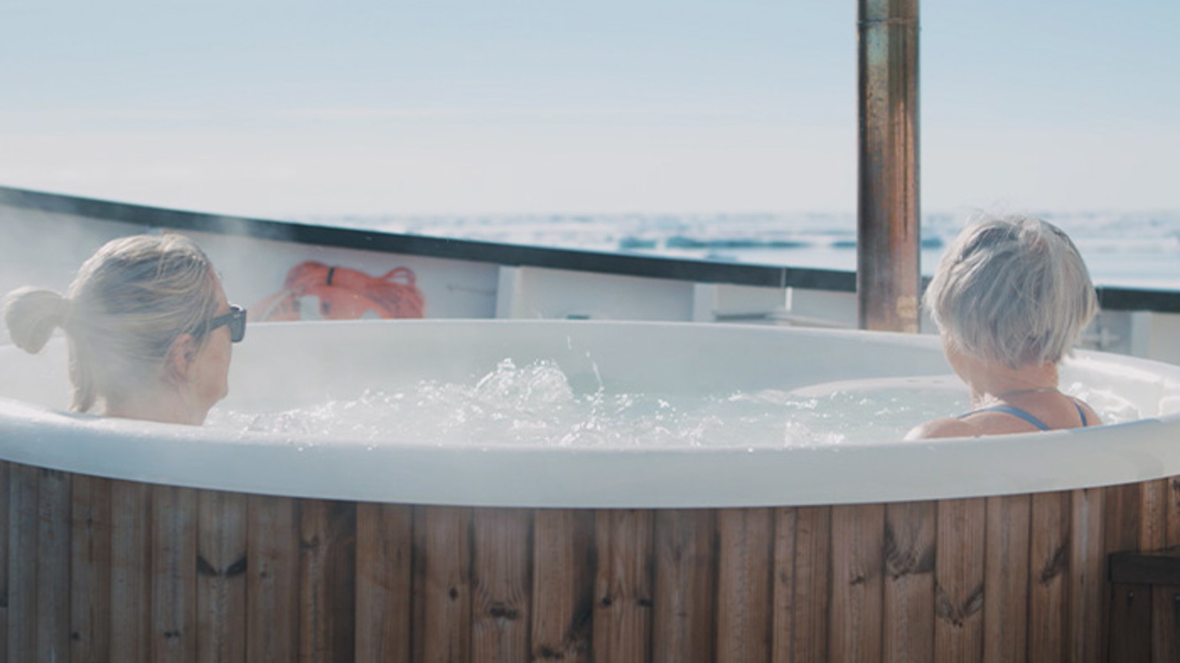 What could be better than slipping into a warm bath after a day in the wilderness? Out on deck, there's a wood-fired hot tub where you can relax and savour the moment while witnessing the Arctic landscape pass by.