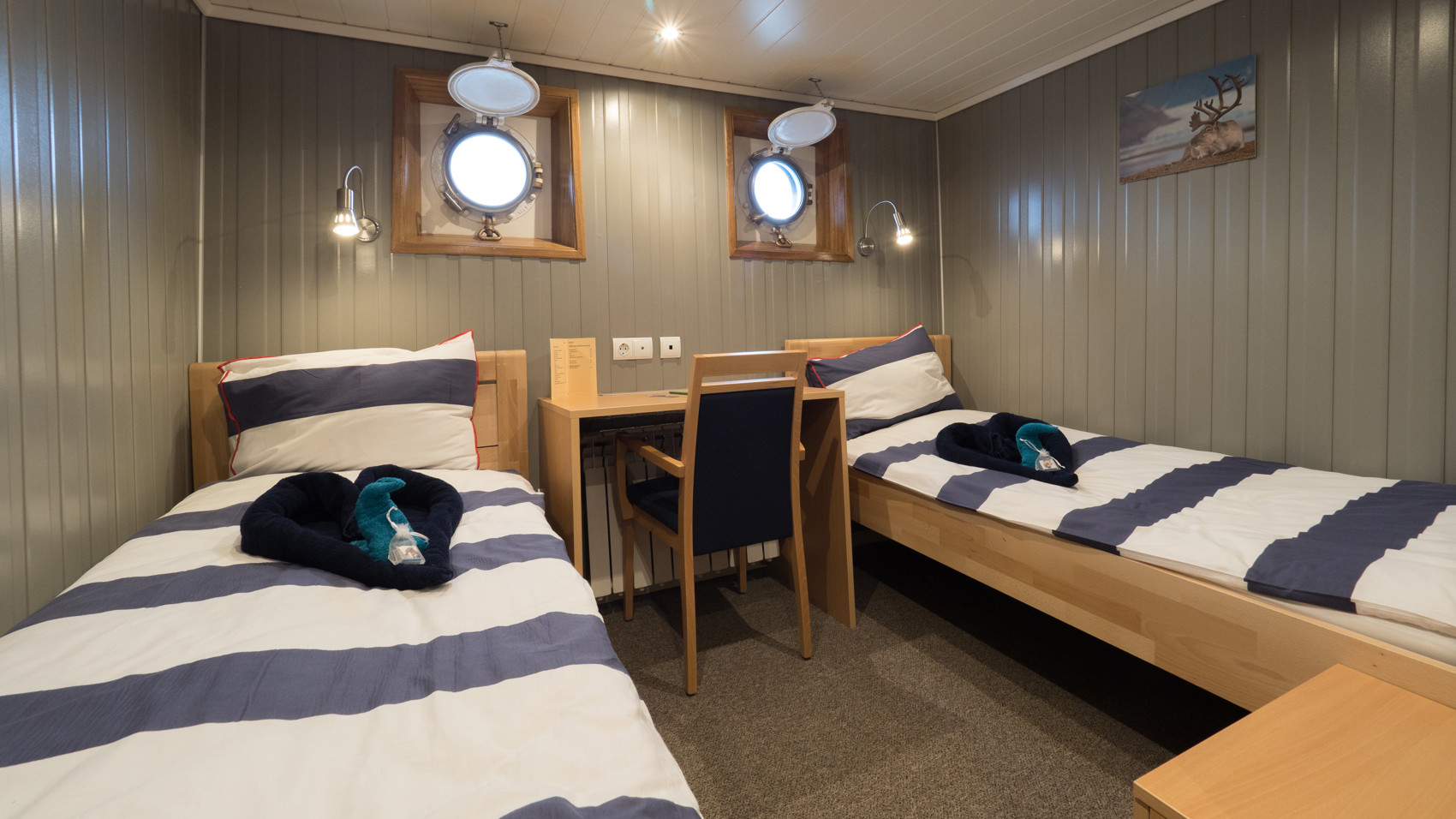 M/S Sjøveien offers eight outside cabins, all with private facilities. On the lower deck, you will find four double cabins with portholes (small round windows). On the main deck there are two larger twin cabins with windows and one large superior cabin with a double bed and windows. The eighth cabin, another superior cabin with windows and a double bed, is situated on the upper deck.