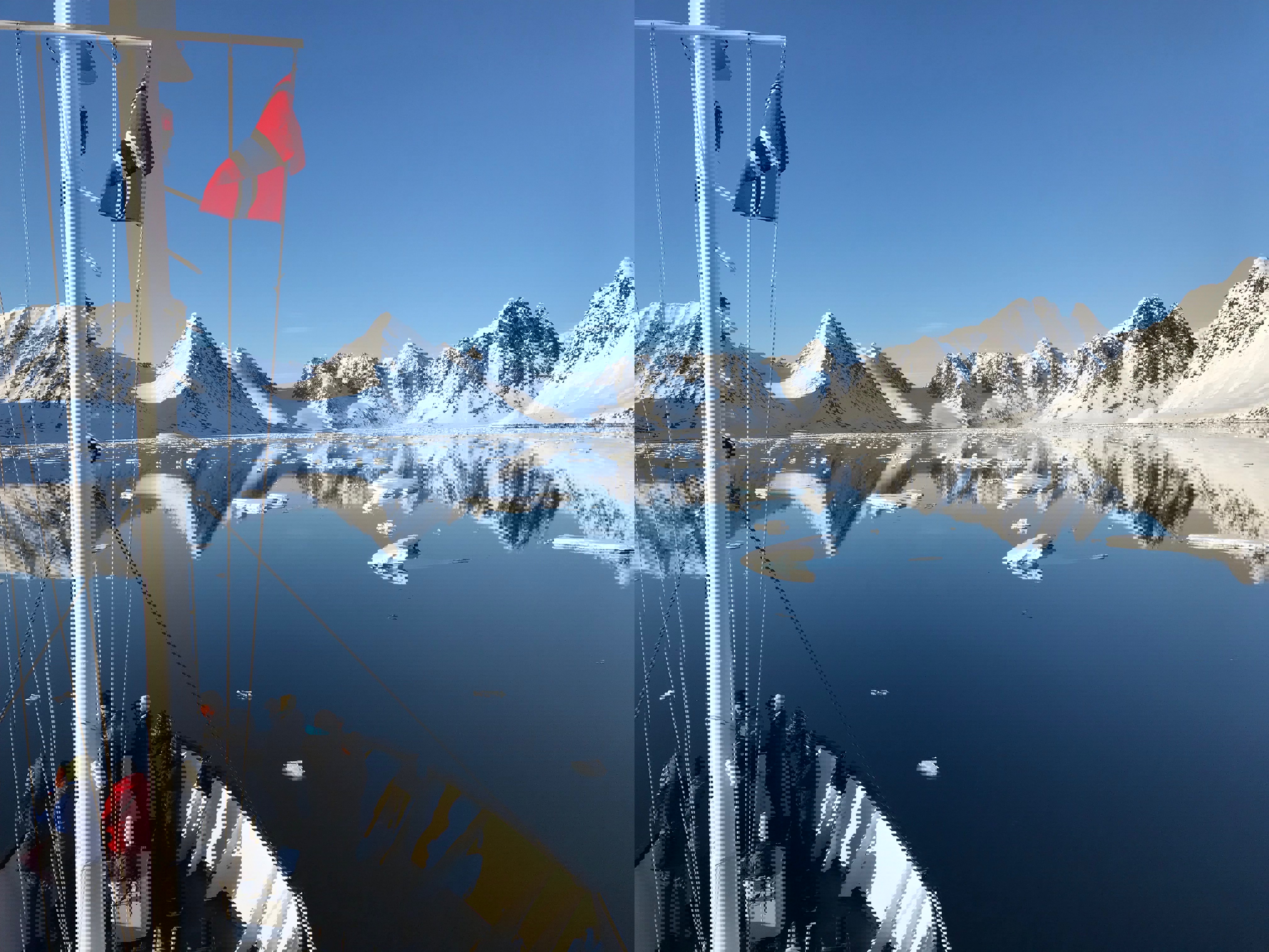 My watch says it is just before midnight when Max, who is traveling with us as a photographer, says that I have to go out to admire the beautiful surroundings. Honestly, I first hesitated, thinking that then I have to dress warmer, at least bring a beanie because my hair is still wet after the shower I recently took. But once I get out on deck I regret nothing but that I did not do it earlier - the sea is calm and looks just like a mirror, and for a brief moment it is too difficult to decide what is up and down. The horizon is nearly invisible as the sky and sea are seamlessly woven together, and the mountain peaks are almost perfectly reflected on the water's surface.