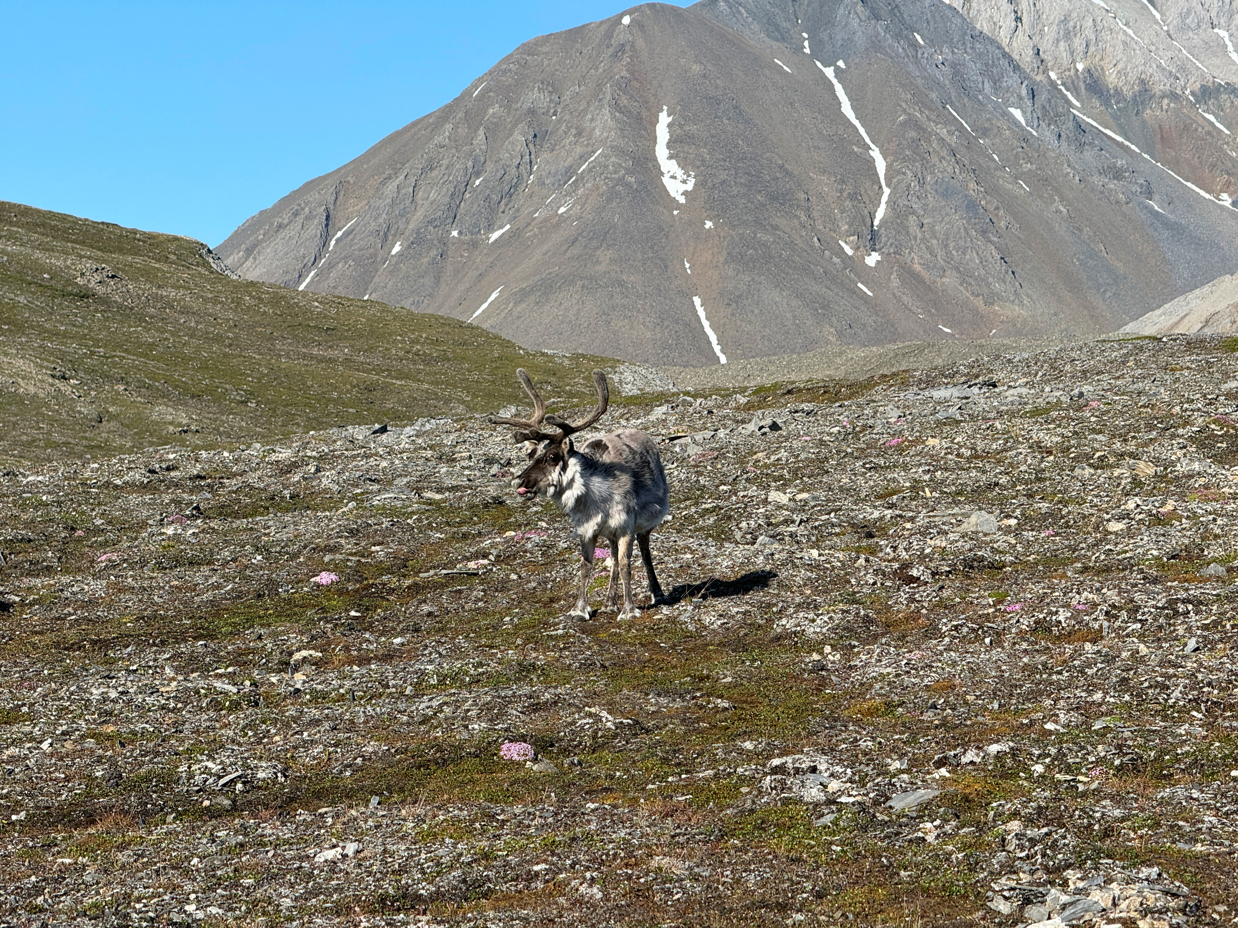 Strolling through the tundra on shore at Gjertsenodden we compared it to a national forest, the ground was covered with Mountain Avens, Moss Campion, mosses and lichens. And Reindeerscat. We didn’t have to look long before we spotted the offenders...As we stood quietly watching and taking photographs, the small group of reindeers came closer and closer. With next to no enemy, they are very relaxed and sometimes curious.It was wonderful to watch them graze every Moss Campion clean of their pink flowers, like lawn movers, as they peacefully walked past us.