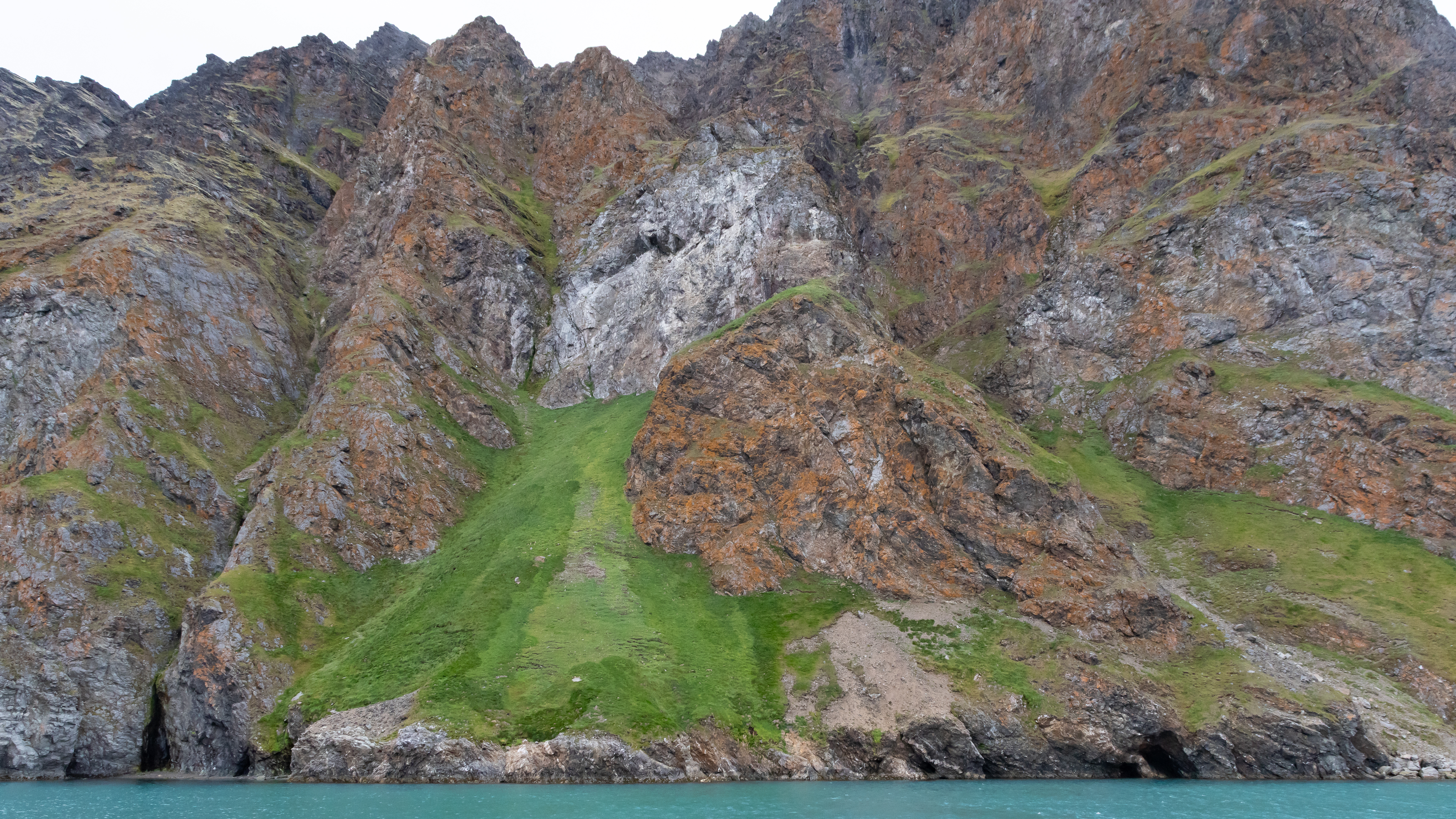 Our journey continued toward Tinayrebukta, with a stop along the way at a small bird cliff. Although the nesting season had passed and most birds had departed, just as we were preparing to turn the ship around, we spotted an extraordinary sight – a rare blue morph Arctic fox! As it turned out, he was part of a fox family. We watched as two white foxes and their blue-coated sibling romped through the grass, scampering up steep slopes, mock-fighting, and playfully tugging at the remains of their latest bird meal.