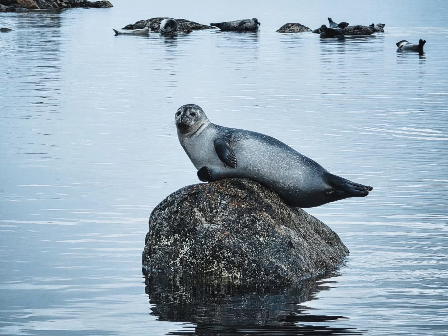 Harbour seals perched on their comfortable soft rocks at low tide, calmly watching as we gently cruised by.