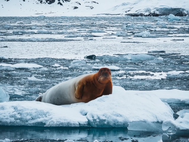 The first walruses hauling out on melted sandy beaches, with patches of snow still reaching near the shoreline.