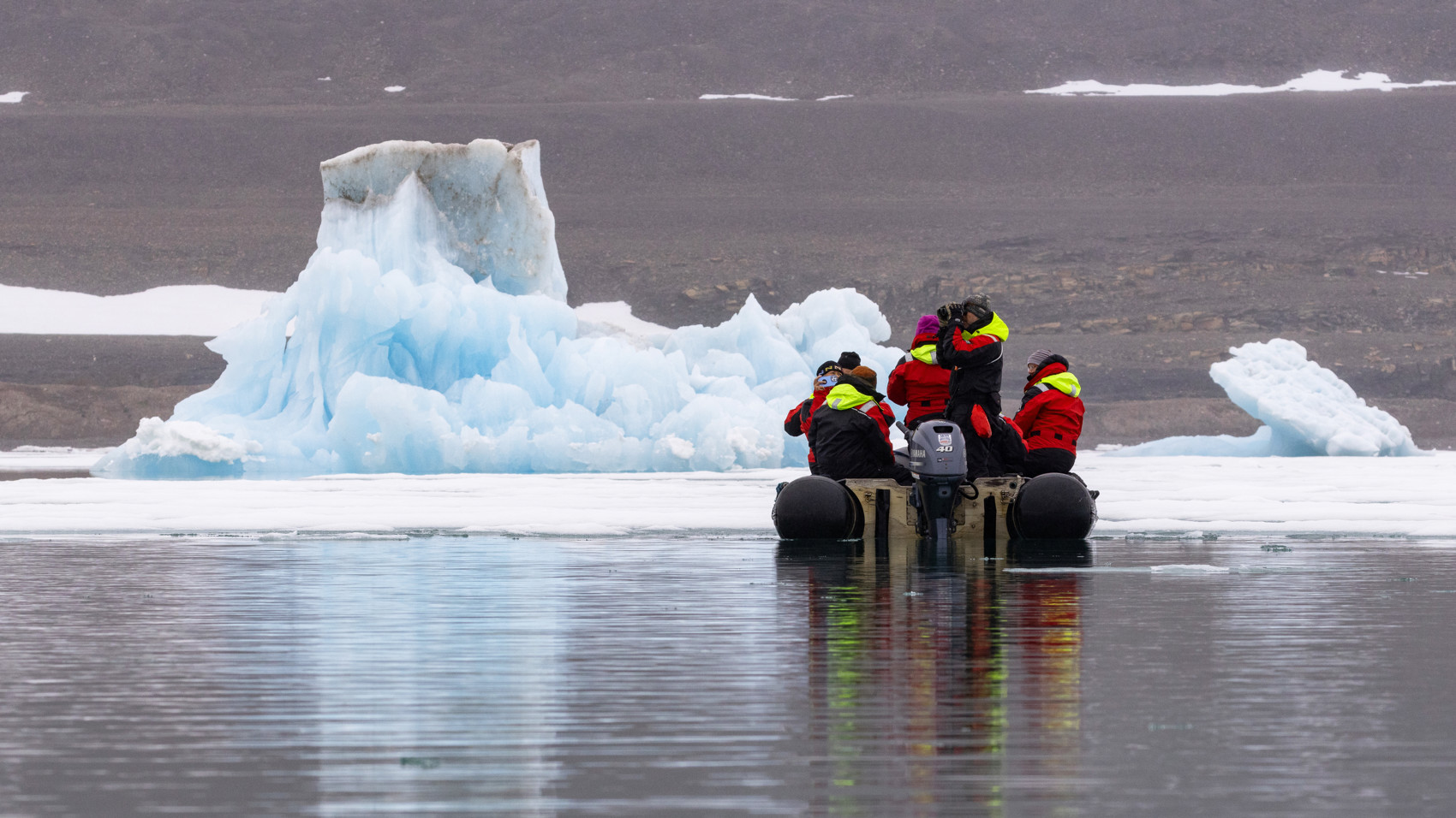 We are completely alone, the morning is dead calm and there is no wind and not a ripple on the water. Our goal is to make a Zodiac cruise close to the Franklin glacier and to an ice floe of pack ice drifting on the western side of the fjord.