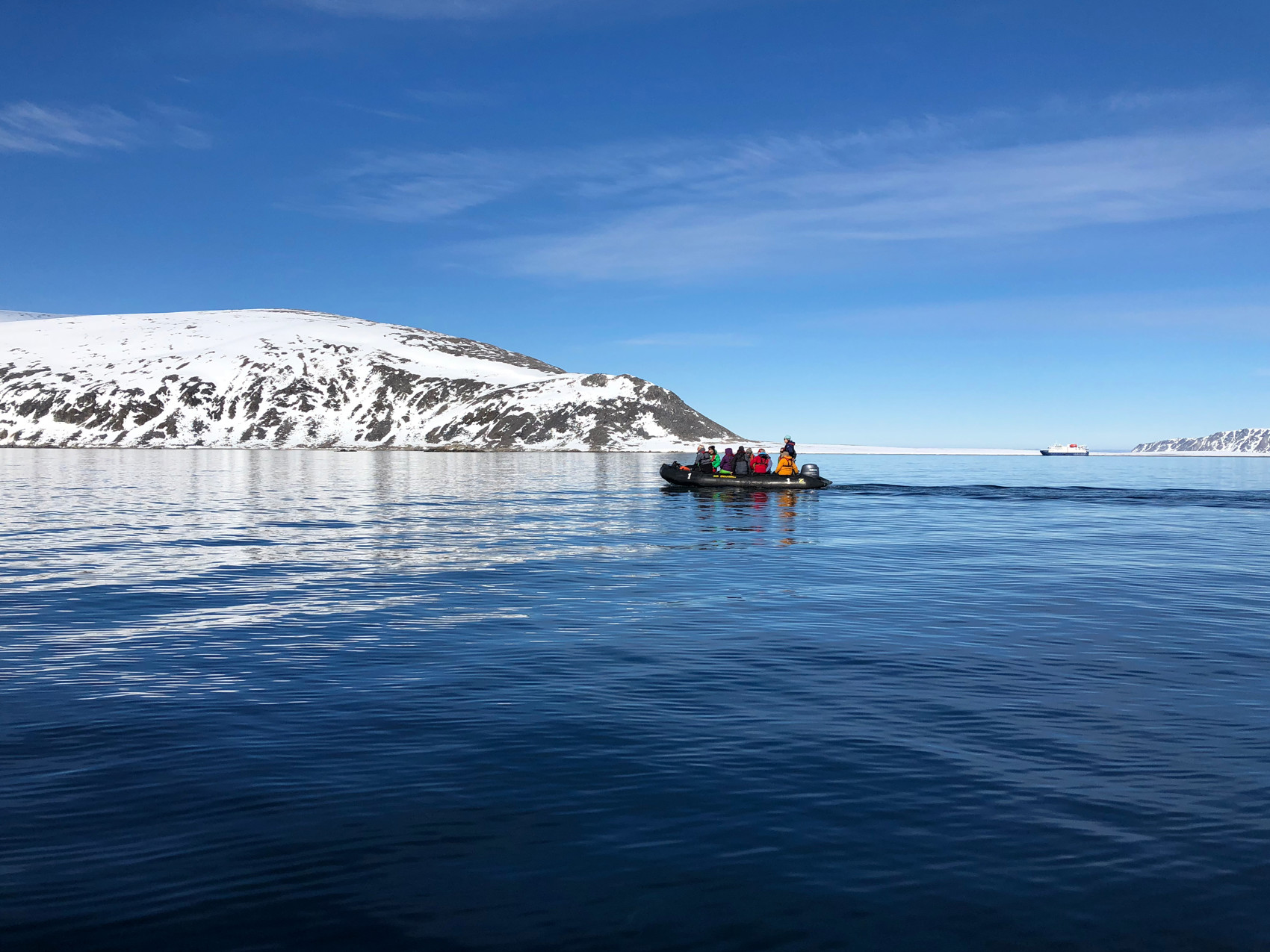 Day 2 we arrive at Alkefjellet. Fog over the sea makes the view magic and my lungs are filled with fresh air. Someone spotted the first beluga whale of the season, and now we are leaving the ship in the Zodiacs. Thousands of Brünnich’s guillemots are nesting on the rocks. Some Arctic foxes are curiously looking at us from the beach. I realize I have been sitting in the Zodiac for two hours admiring the penguin-like birds, but two hours doesn’t feel like a long time. In the Arctic time is different, since where the experience is everything time gets different.