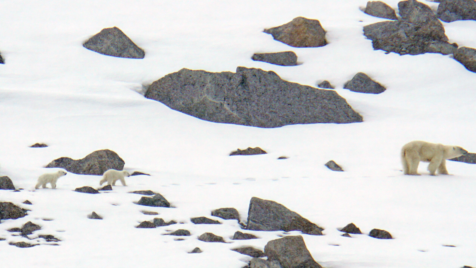 It's completely silent as we ride in the Zodiac, and there's excitement in the air. When we get closer to the site where the bears were seen we can't see anything but mountains, rocks and snow. Mountains, rocks and snow. Then, on a mountain slope, approximately 50 meters above the beach a female polar bear is walking followed by her two cubs. It feels like time is freezing. All I can hear is the waves gently hitting the Zodiac, then the shore, and the sound of a camera focusing on the object. I'm sure someone said something, changed their position in the Zodiac, maybe said "I can't see..", but I can't hear any of it. In this moment it's just me and the bears, nothing else.