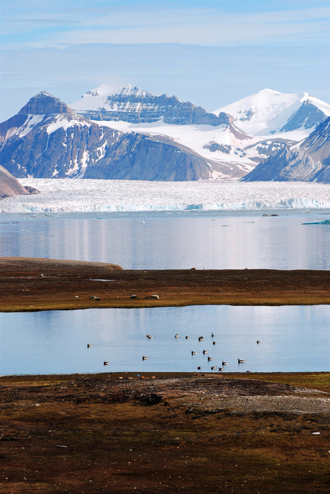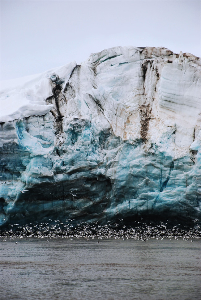 During the trip there were many moments of rapid weather changes and beautiful settings, and we got to experience an especially memorable one while we headed out in the Zodiacs during an early morning, and later on returned to the ship as the fog lifted, revealing the colours of the astonishing landscape surrounding us in Hornsund. Other moments of minor miracles, such as watching the ivory gull feeding in front of a glacier, seeing ice shapes like stolen out of fairytales, the surprisingly lush and green playgrounds under the grand bird cliffs, enjoyed by young foxes, the many shades of grey on a rainy day, the many colours of ice in different light, seals popping their heads out of the water to have a curious look at us in the Zodiac, the warm welcome of our Russian guide in Barentsburg, Kitiwakes nesting on the window ledges in the village.. and much more.