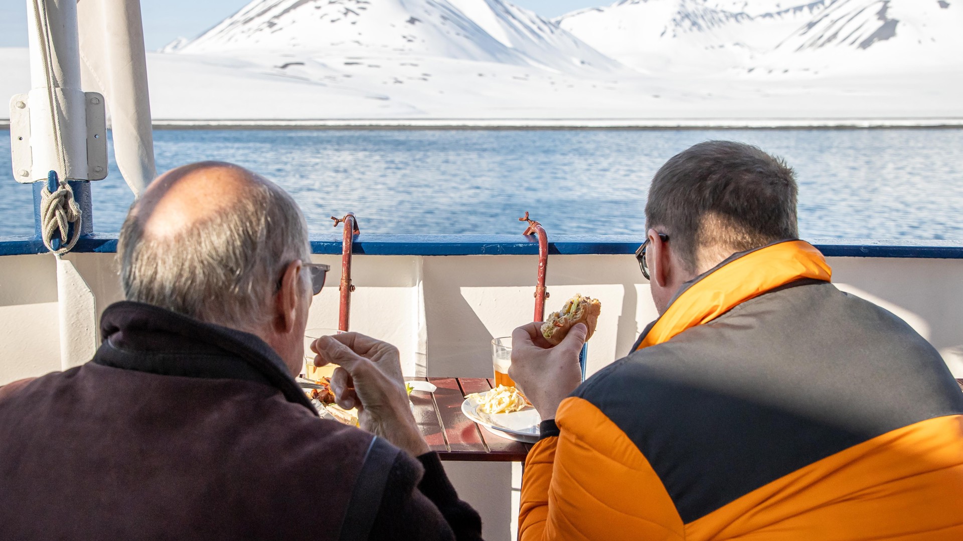 Afterwards, we enjoyed a barbecue feast prepared by the team. Plenty of grilled delicacies were savoured in a stunning setting, surrounded by mountains and glaciers. We even heard that after most had gone to bed, some were still dancing under the midnight sun on the outer decks.