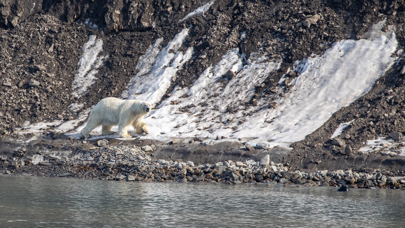 As we were sailing back North towards Woodfjord, Daniel spotted a bear on the coastline. After observing it for a while by ship, we went out in Zodiacs to see it a bit closer. The big heavy male was clearly affected by the heat (8DgC today), and after swimming and walking for a while it laid down for a well-earned nap. The last thing we saw before returning was a big polar bear skull peeking at us over the rocks.