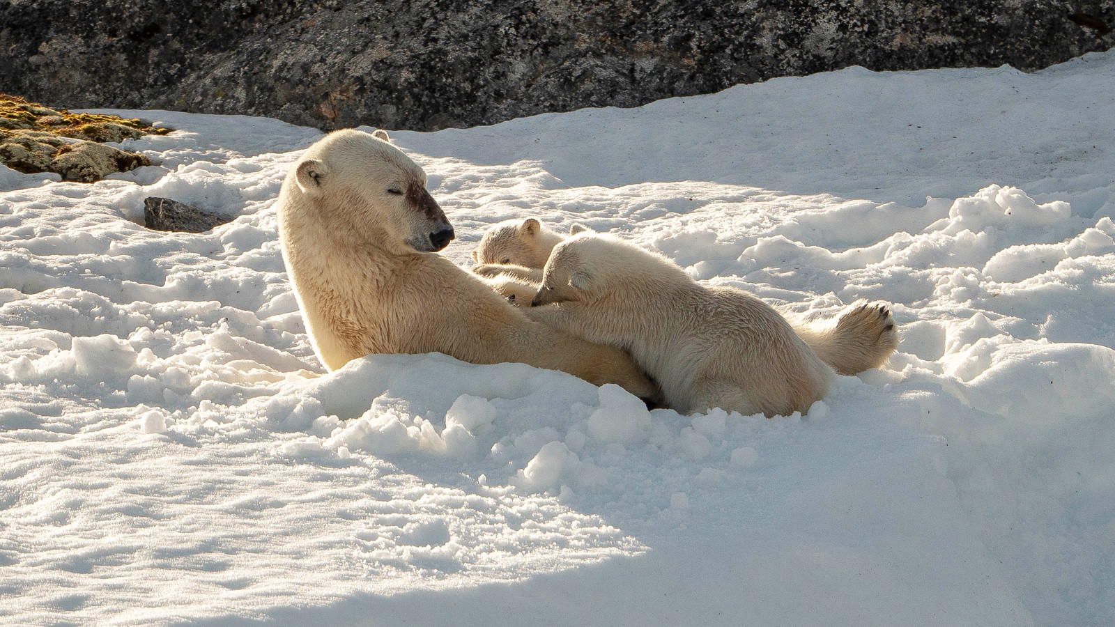 Later we visited the same walrus, resting in the sheltered Gullybukta. Here, we also found nesting Arctic terns were gathered in tens of pairs. More perfect conditions awaited us in Hamiltonbukta where we witnessed the activity of our first Brünnich’s Guillemot and Kittiwake colony, plus our first Polar bear, a mother with two cubs of the year scavenging and nursing on the islets in the center of the bay. What a day!