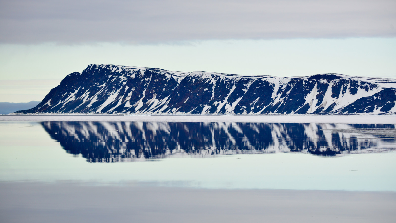 Back on the ship we steered in direction of Brennevinsfjorden, breaking some fiord-ice on the way and enjoying the hills that mirrored themselves in the water and some low clouds that made the landscape even more dramatic.