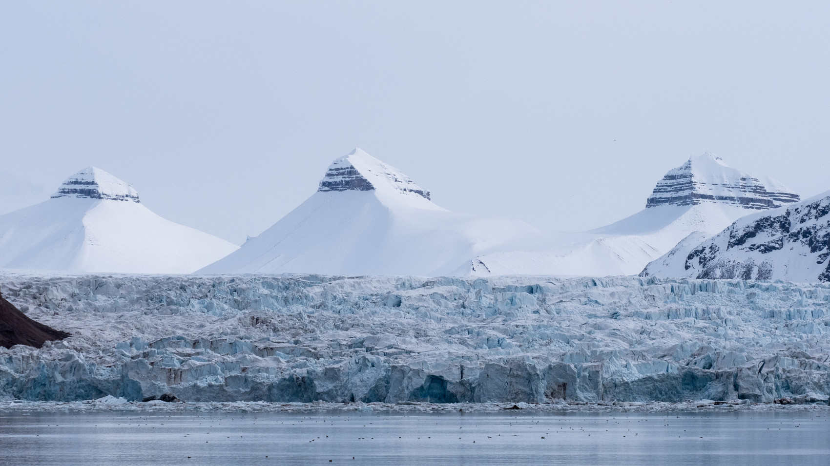 The three mountain peaks Svea, Nora and Dana, which together form the mountain massif Tre Kroner, showed a magnificent background as we approached the glacier.