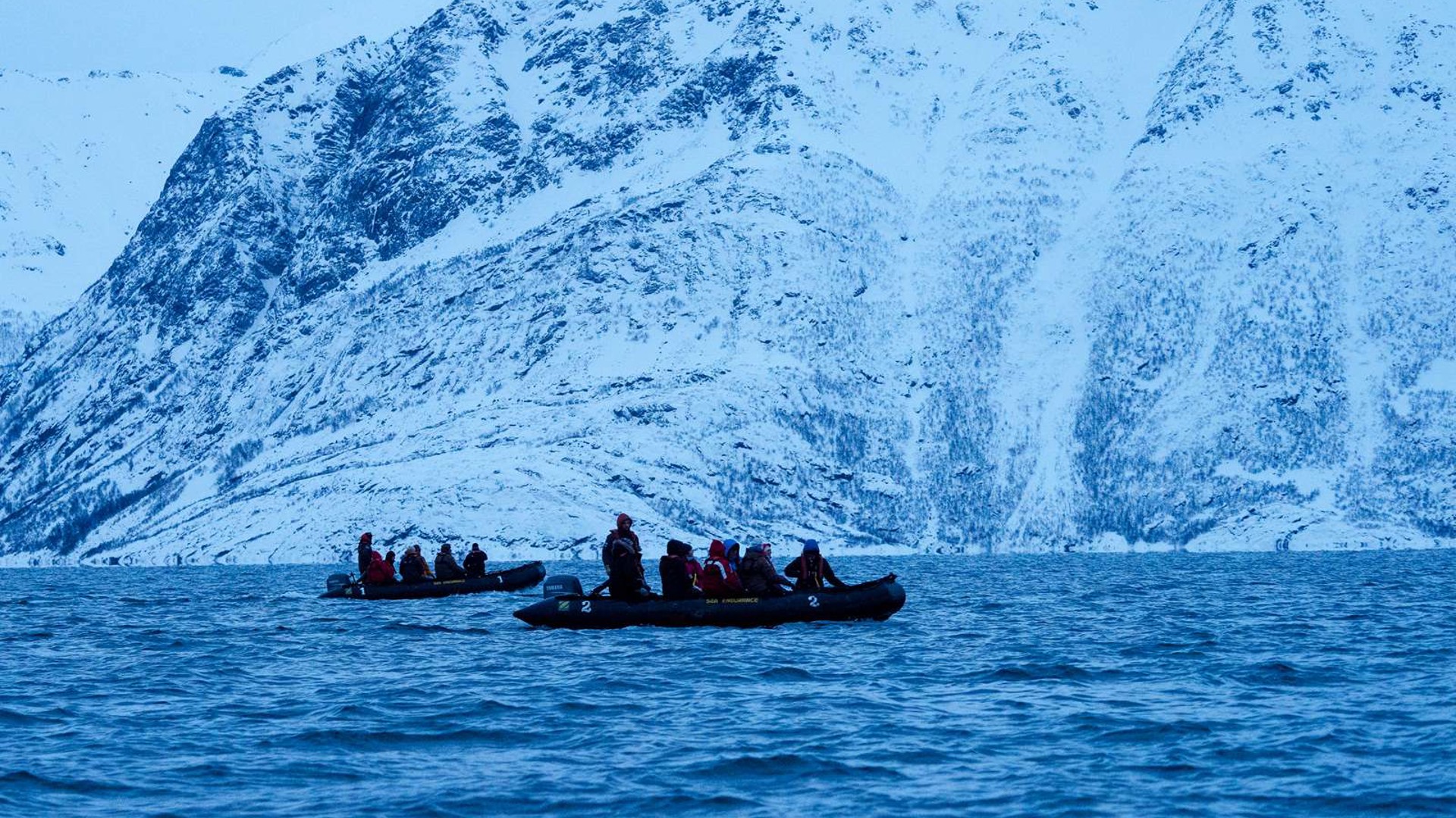 Mid-January this far north of the Arctic Circle is a very special time of the year. The sun hardly appears above the horizon, but that doesn’t mean there is no daylight. Instead, the sky and the landscape glow in ever changing shades of blue. Steep mountains in white, gray, blue and black rise from the sea. It’s as if our journey takes place in a painting come alive.