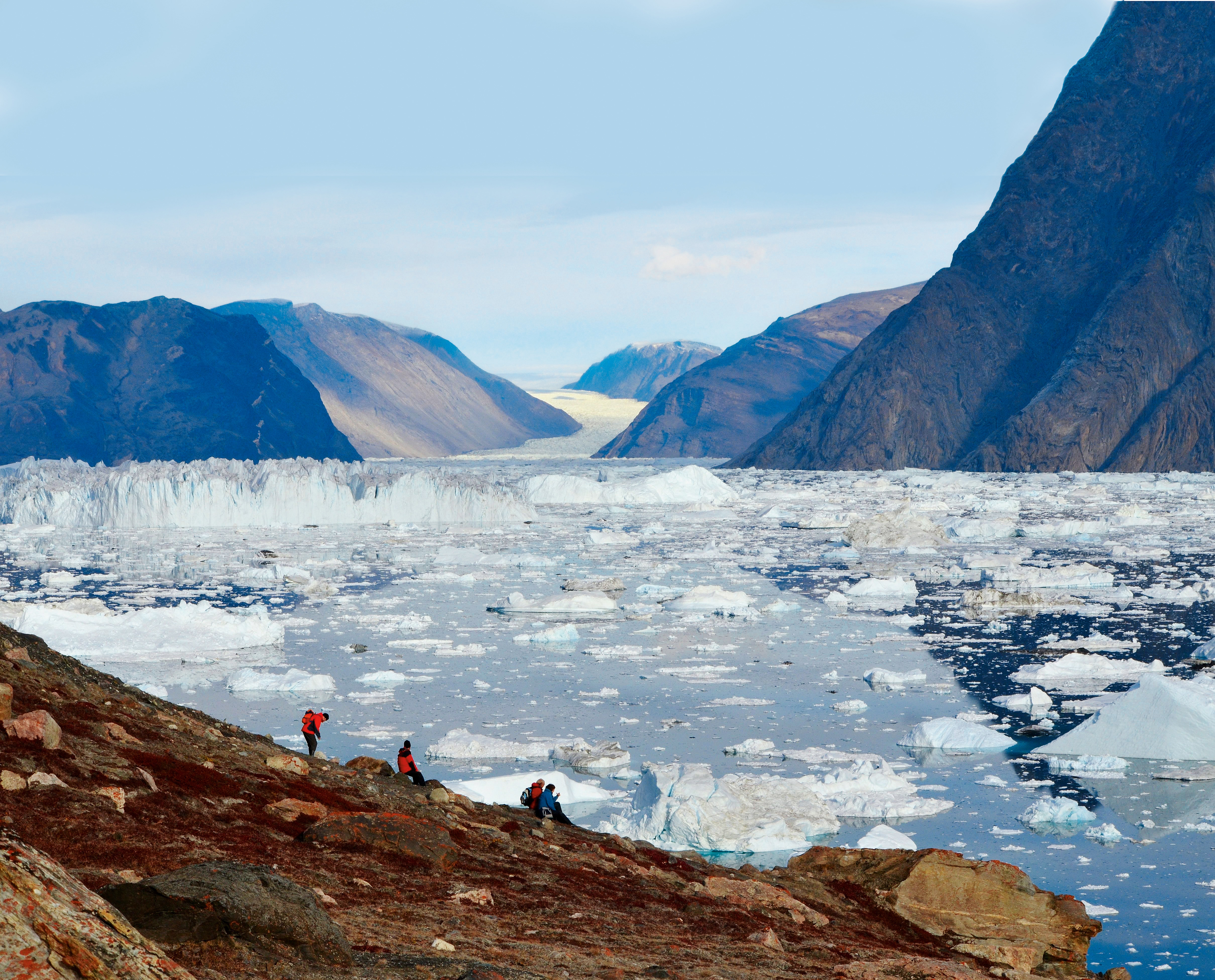 Blomsterbugten, “the Bay of Flowers,” and Ella Ø a paradise for hikers, surrounded by rugged cliffs, ice-choked waters, and striking icebergs, the bay reveals purple- and gold-streaked rock formations unique to the Arctic.