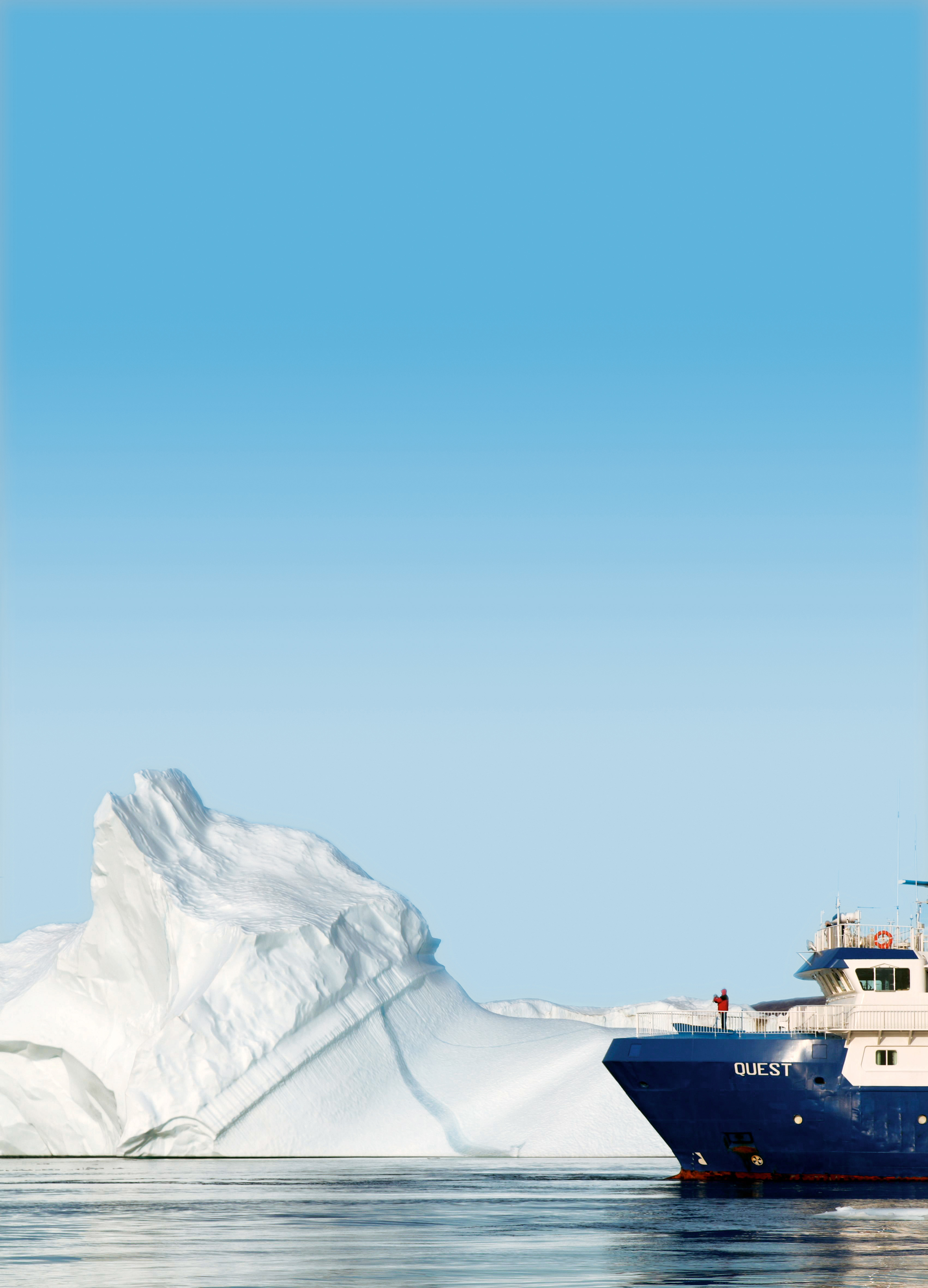 The ship M/S Quest was built in Denmark in 1992 to serve as a ferry along the west coast of Greenland. In 2004-2005, it was completely refurbished into a comfortable expedition ship, and in 2018, the passenger areas underwent further renovation.