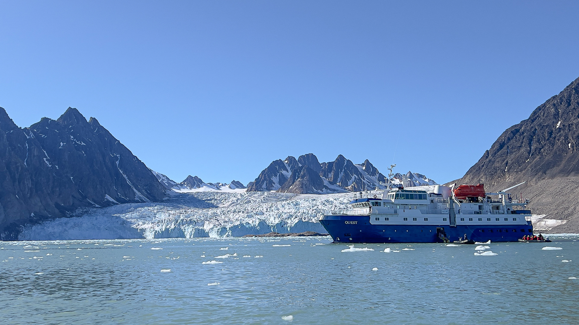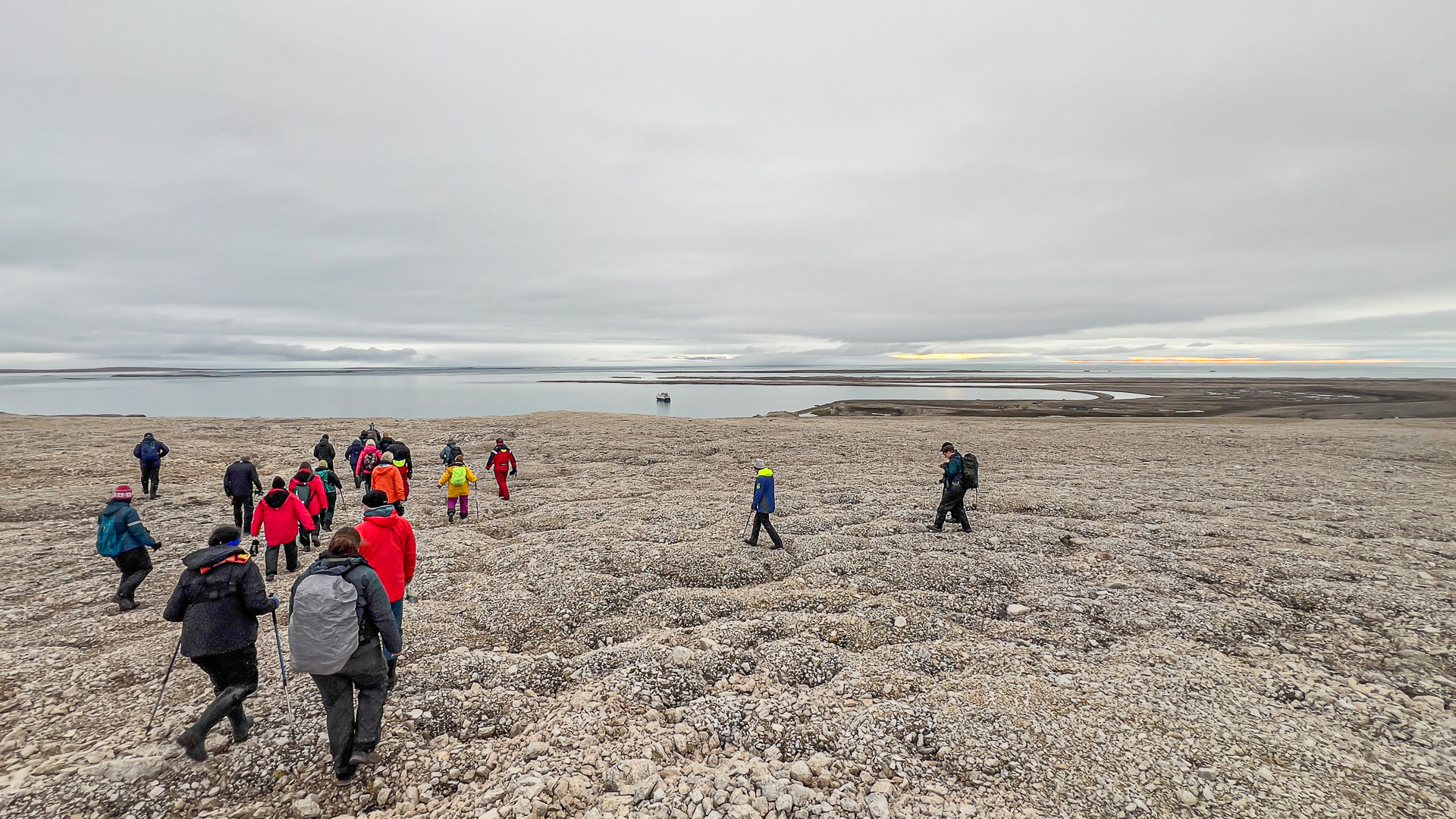 I went with the group that chose the long hike on our landing with M/S Quest on Svalbard. We set off across the well-formed elevated beaches and along ridges filled with Svalbard's oldest fossils, including Stromatolites. We continued to the top of Kinnberget, which stands at 128 meters high, offering a stunning view over Murchinsonfjorden and Oddneset. We took our time to rest and soak in the beautiful scenery.