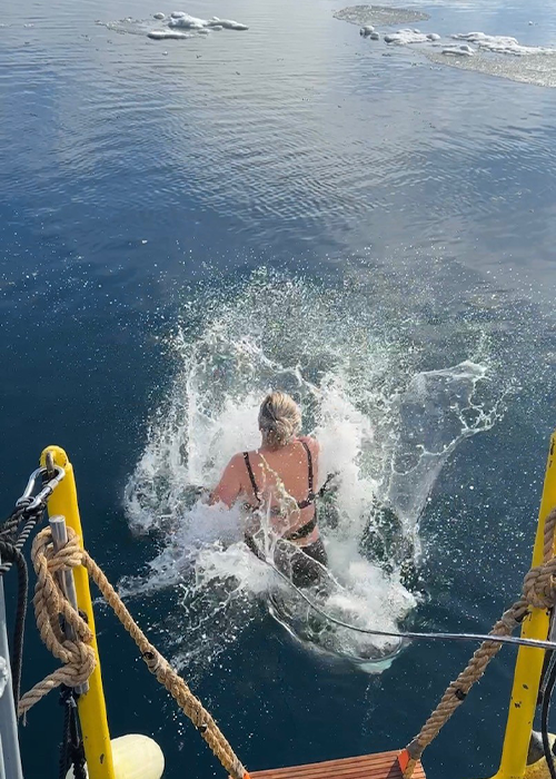 The conditions for my polar plunge in Svalbard could not have been better. The sun was shining and we had a view of snow-capped mountains and ice floes on mirror-smooth water. The crew did their best to cheer us on with music and cheers. It goes by on the fly, and suddenly there is no turning back. 'Refreshing' is putting it mildly, but the feeling afterwards makes it all worth it.