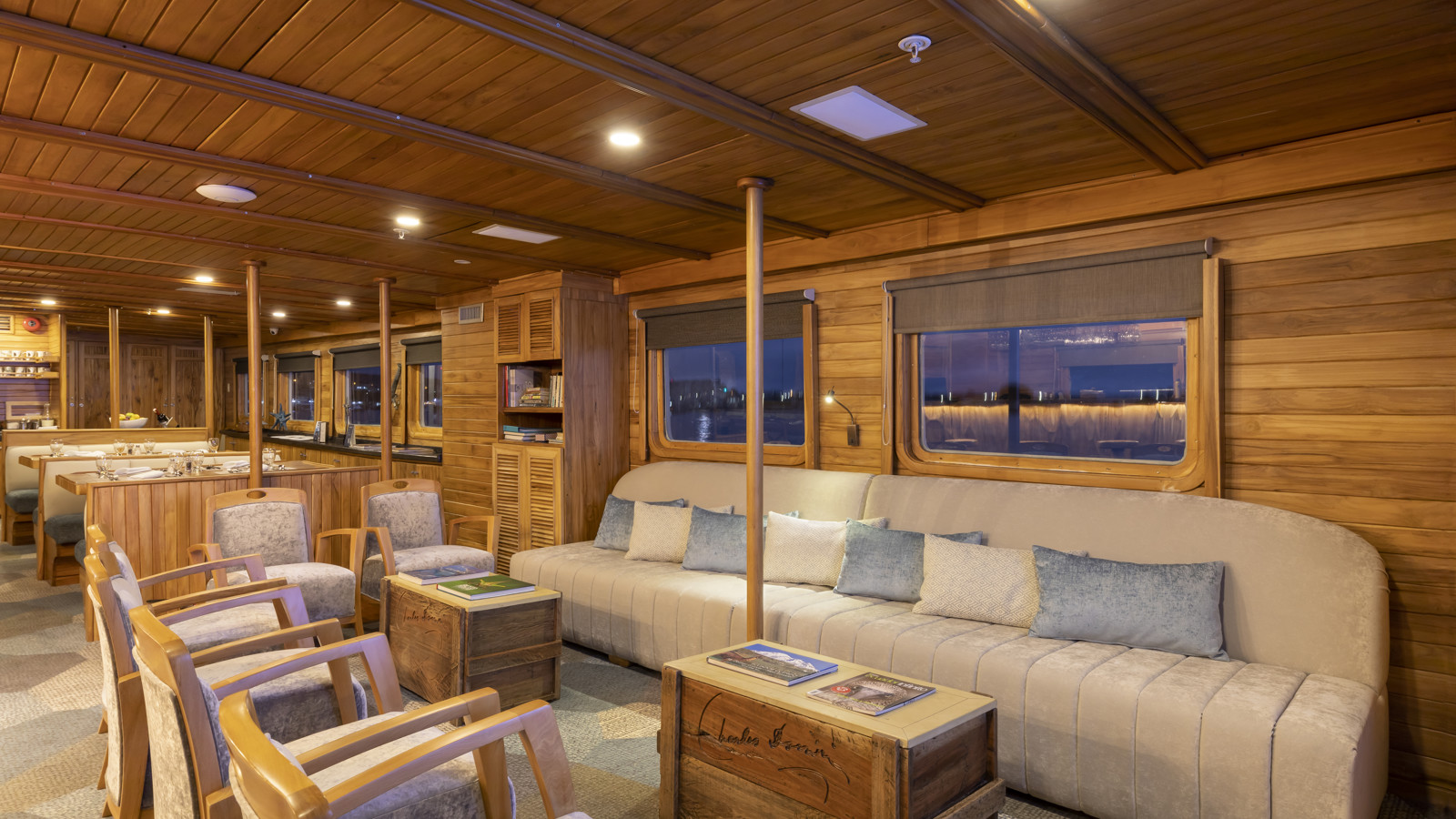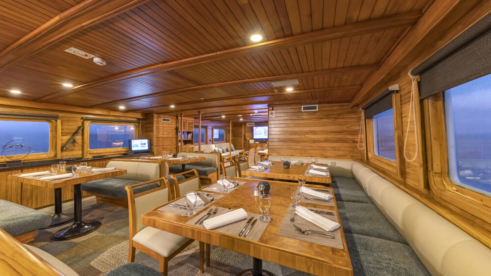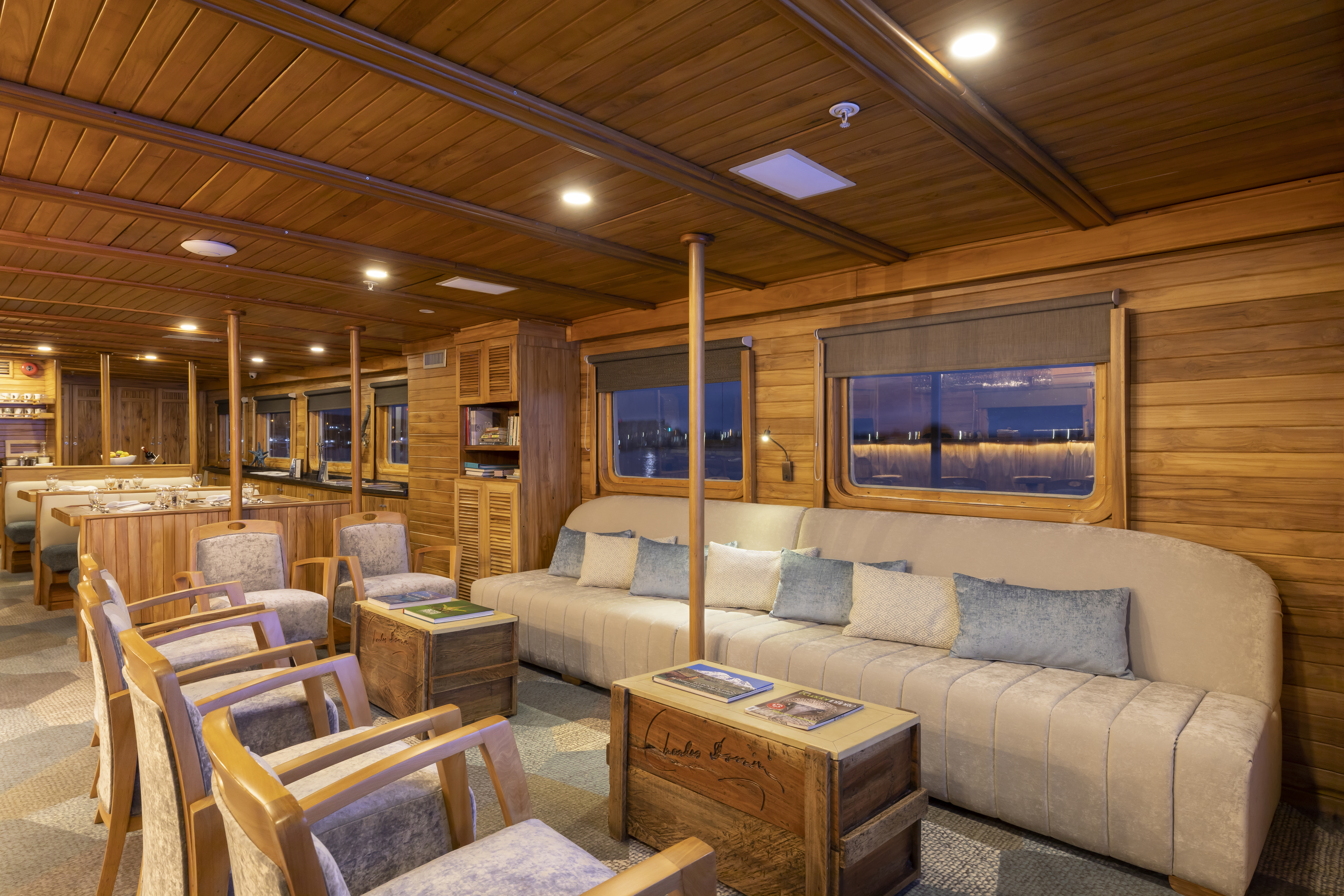 1Our expedition yacht was refurbished in 2018 and the comfortable cabins accommodate 19 passengers. The yacht has the latest navigation equipment and is decorated in classic maritime style with teak and brass.