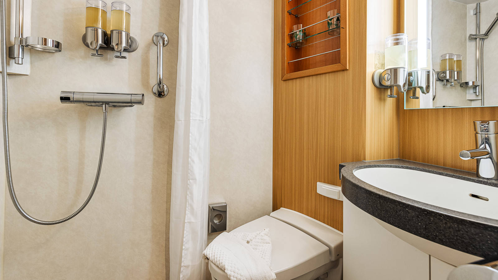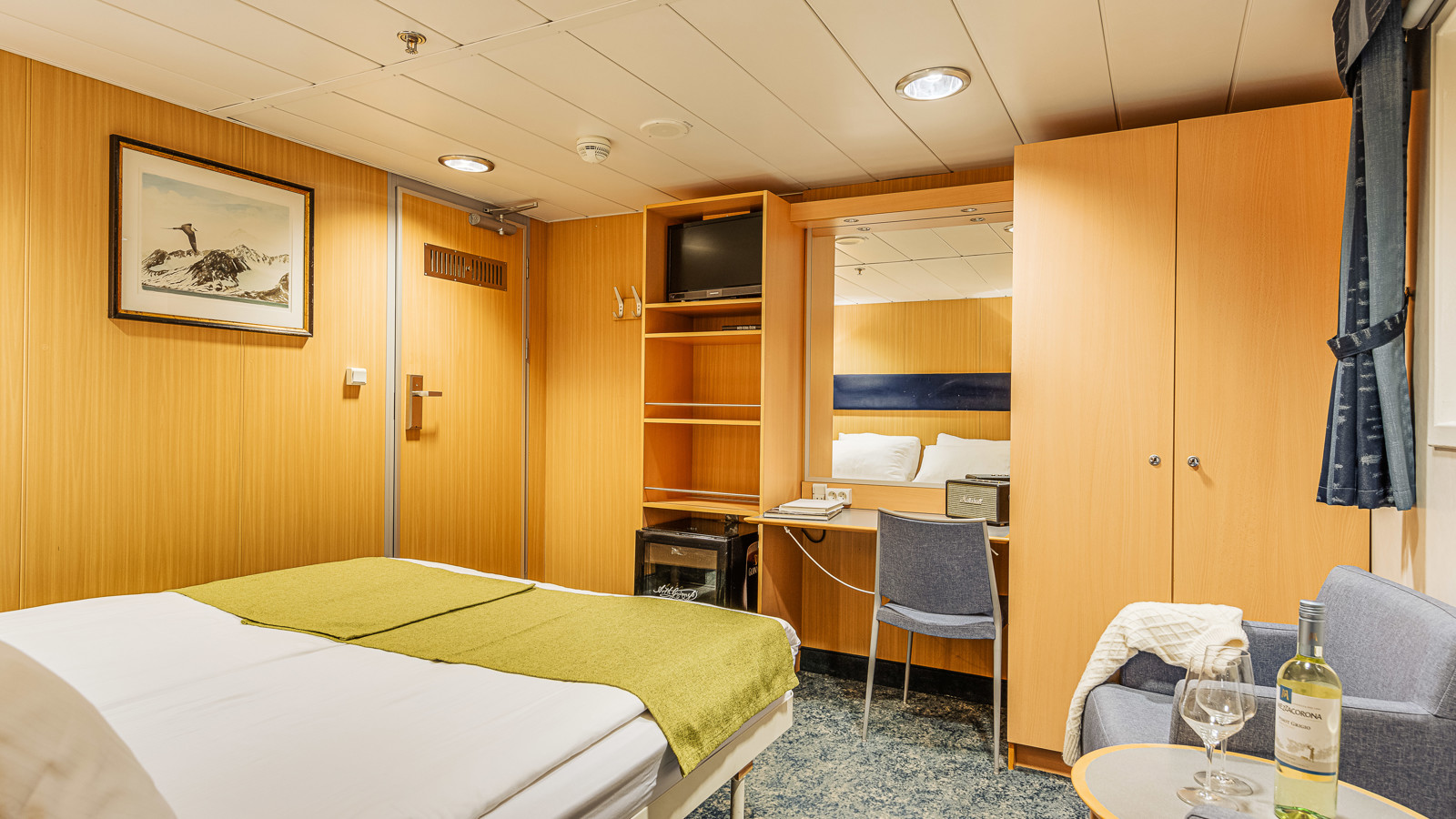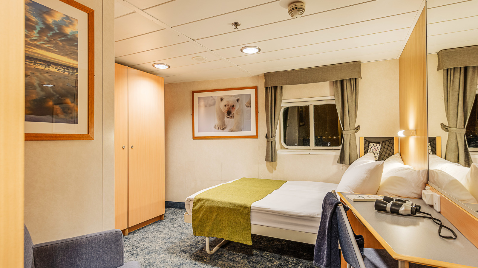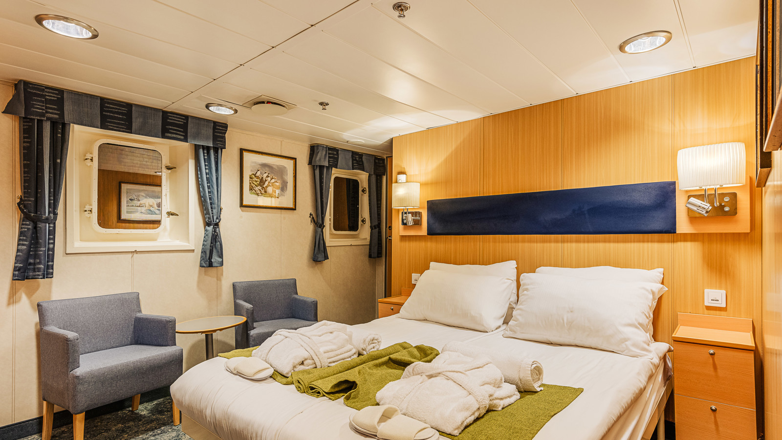 We always offer the possibility to share a cabin on board M/S Quest as many of our guests are travelling on their own. The cabins are divided into women's and men's cabins.