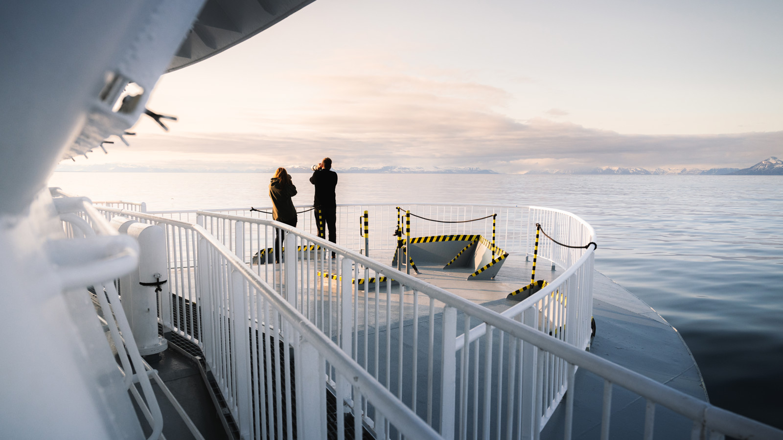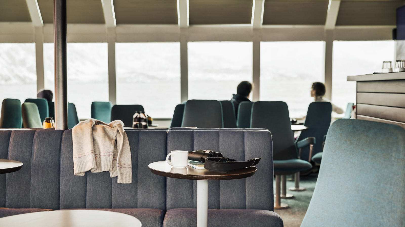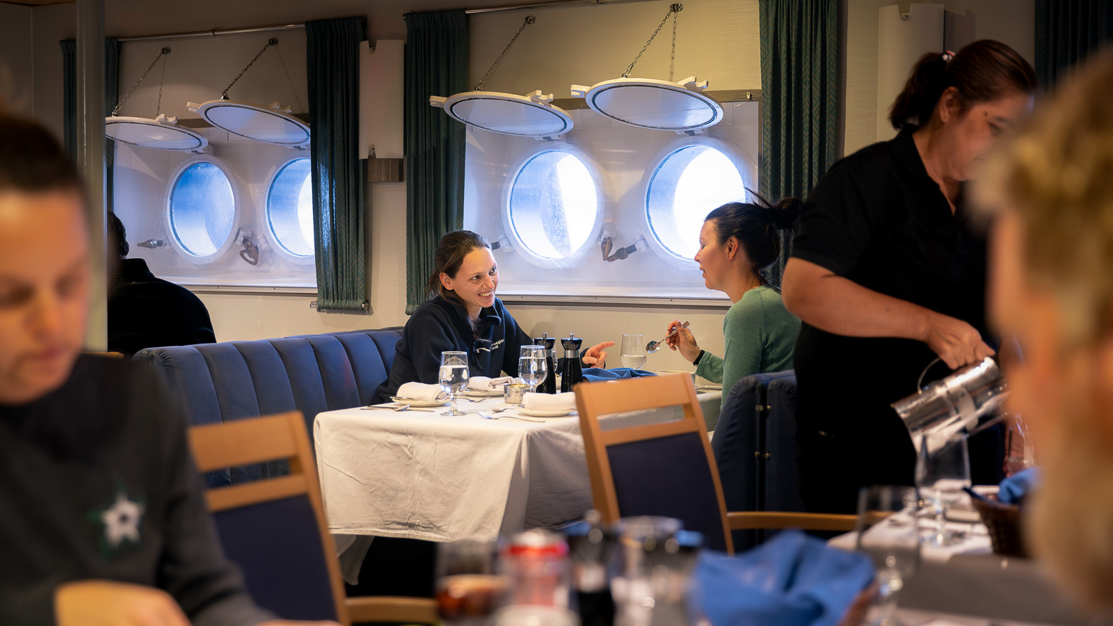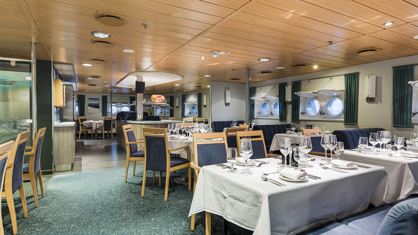 In the dining room, you enjoy delicious meals between landings, while the panorama lounge offers breathtaking views of the surrounding landscape. This lounge serves as the venue for entertaining talks about the area's flora, fauna, and history. It also features a bar and a small library. The ship boasts spacious observation decks for you to enjoy the stunning vistas. The bridge welcomes you around the clock, and there is always something to see or search for. You are welcomed by an international crew, and the atmosphere on board is relaxed and very friendly.