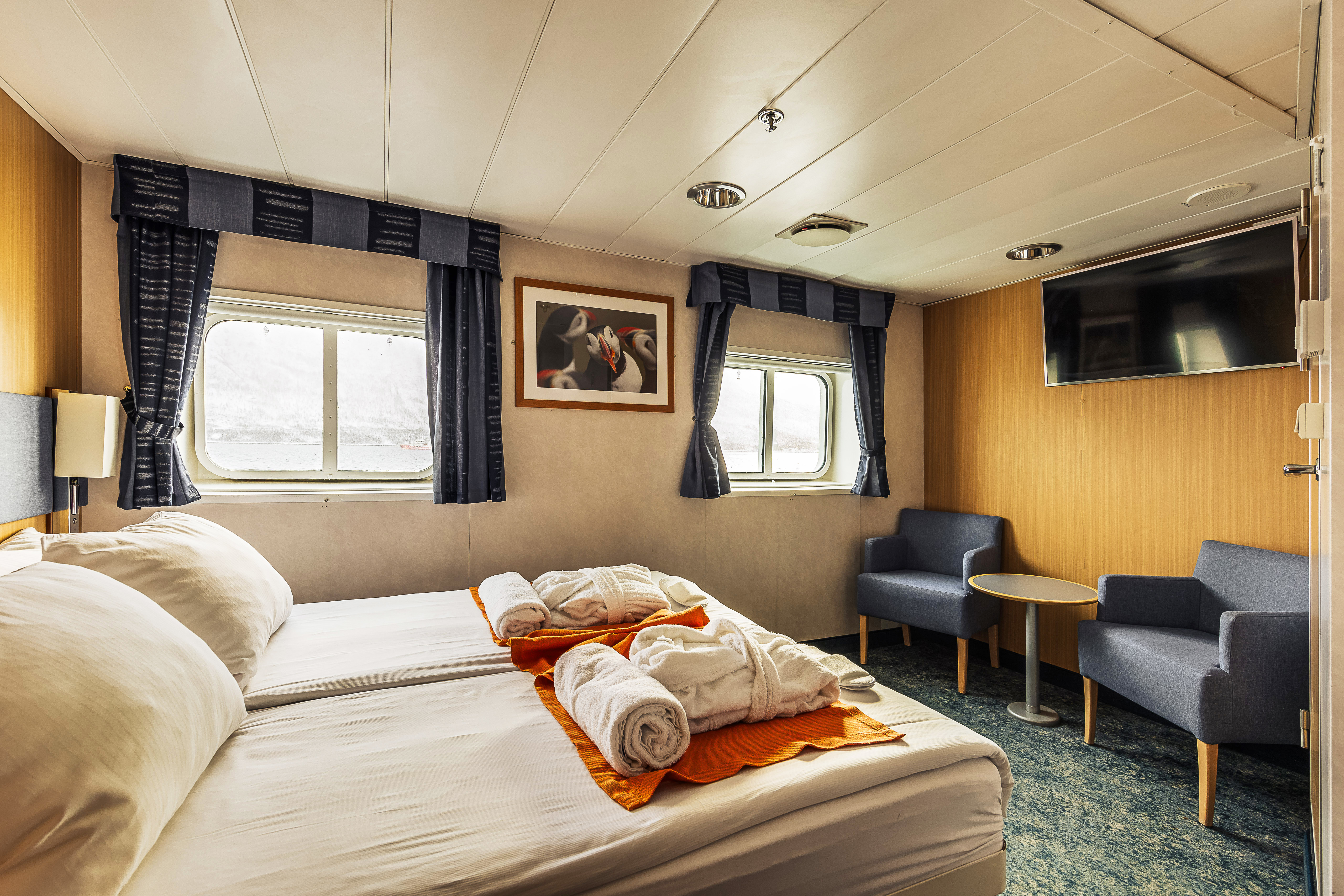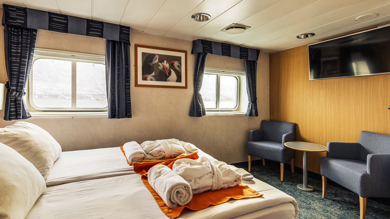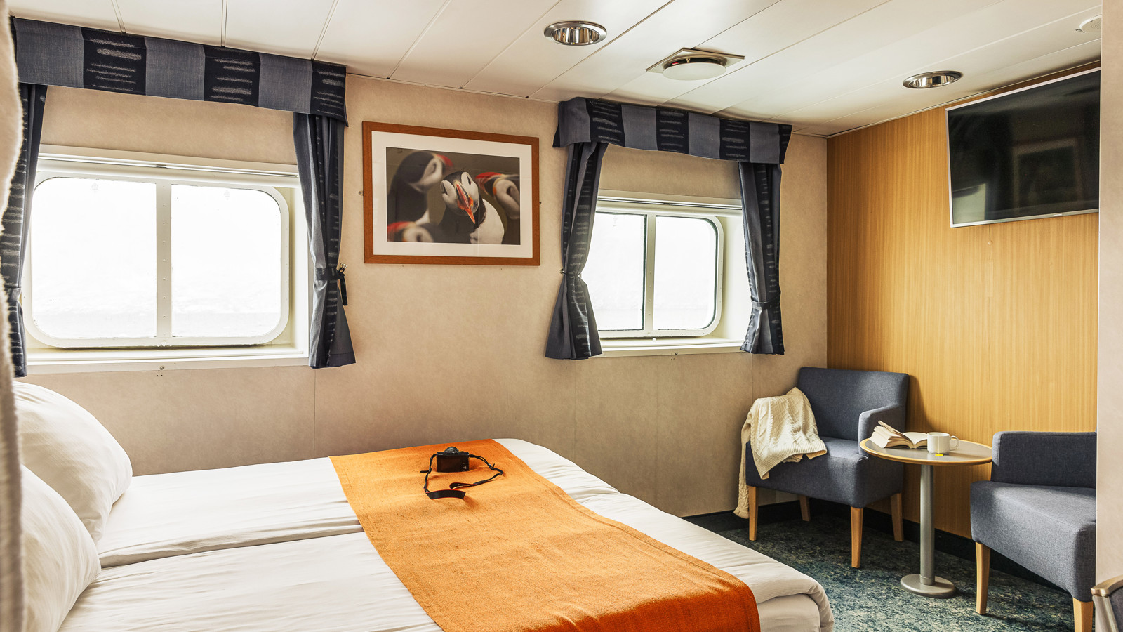 M/S Quest can accommodate 50 passengers, with all 24 cabins being outside cabins equipped with private facilities. The triple cabins feature upper and lower berths, while all other cabins have either two lower berths or a double bed. Each cabin includes a desk with a chair and a cupboard for storage. The superior cabins are spacious, featuring armchairs and a TV. The owner’s cabin offers a double bed, two large picture windows, a separate seating area, and a TV.