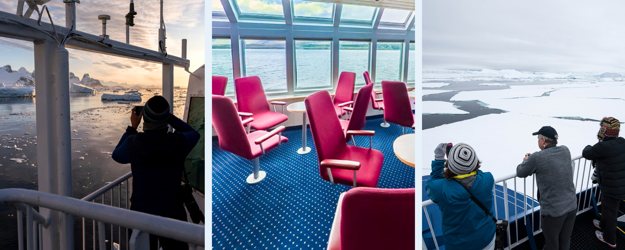 In the Panorama Lounge you can enjoy a cup of coffee while taking in breathtaking views of the surrounding polar landscape, the perfect gathering point after a day’s adventures. Outside, the open observation decks offer constant opportunities to spot wildlife, watch towering icebergs drift past or simply enjoy the magnificent scenery. Guests are also welcome on the bridge at any time, where there is always something to discover as the ship navigates through the Antarctic environment.