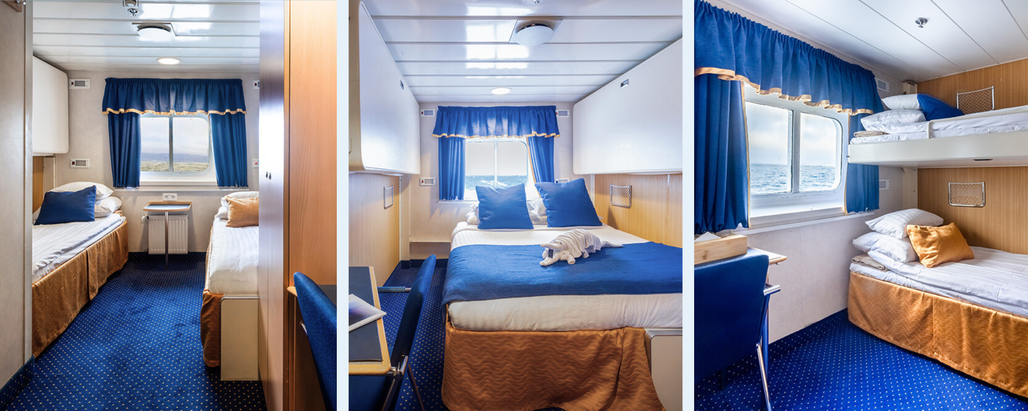 Ocean Nova accommodates up to 78 passengers in comfortable twin and triple cabins, all with exterior views and private facilities. Each cabin includes a picture window, a desk with a chair, and practical storage space for clothes and equipment, as well as additional space under the bed for suitcases. The cabins are individually heat controlled to ensure a pleasant and comfortable stay throughout the voyage.
