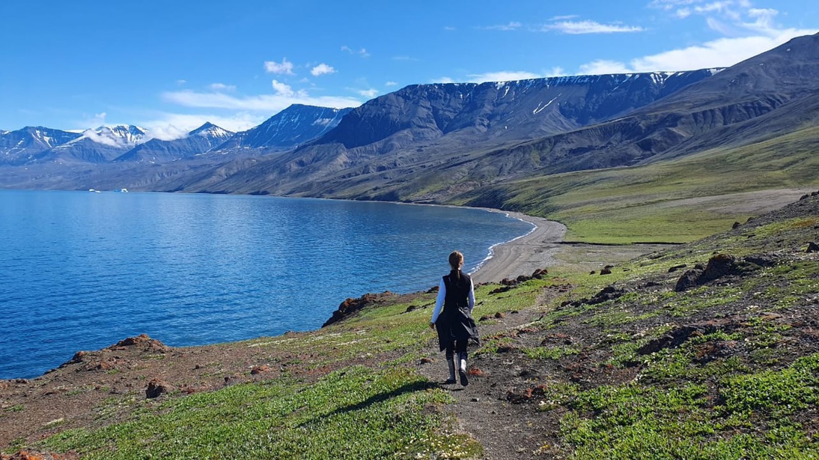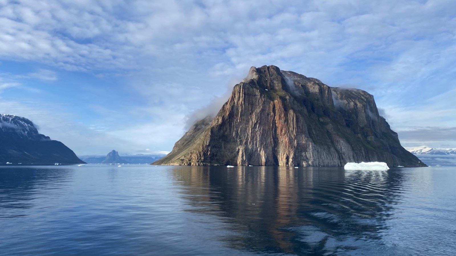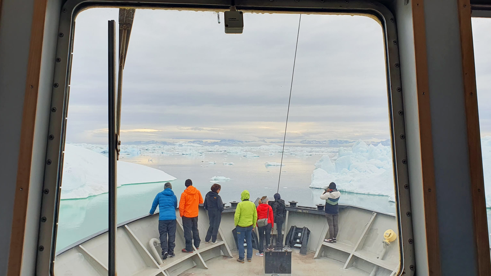 We enjoy breakfast with a view of the volcanic cliffs of Disko Island. It is unique in its geology and lush vegetation and stands out in the otherwise ice-packed bay. Greenlandic legend says it is because the island was moved here from the south by two kayaking seal hunters, and when it entered Disko bay a witch from Ilulissat cast a spell on it to ground. The island invites to beautiful hikes and the columnar basalt rocks show the island's volcanic history.