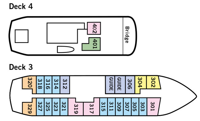 Many of our travellers journey solo, so in addition to single cabins, we offer the option to share a cabin on board the M/S Quest. Shared cabins are divided into female and male cabins. Contact us for availability!